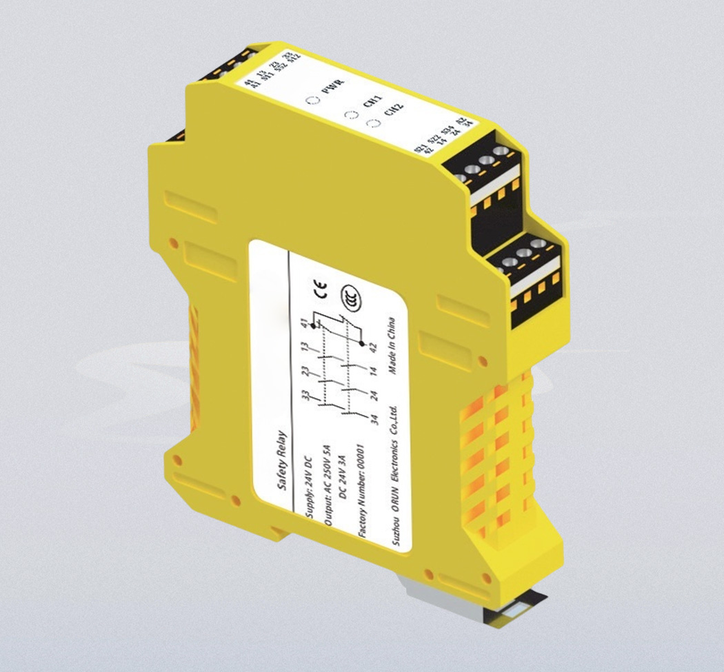 注意:安全继电器模块安装在防护等级为IP54以上电控箱内,使用DIN导轨(35mm)安装固定。